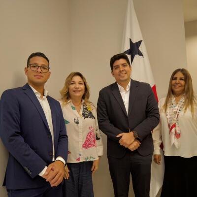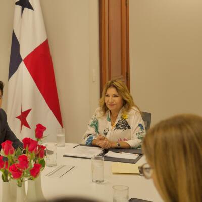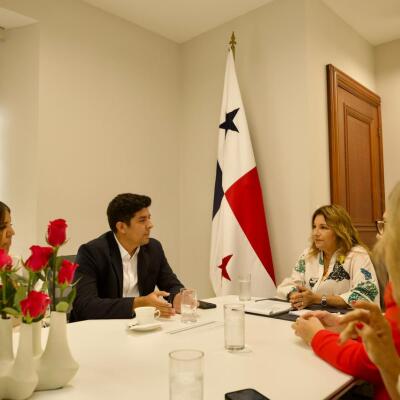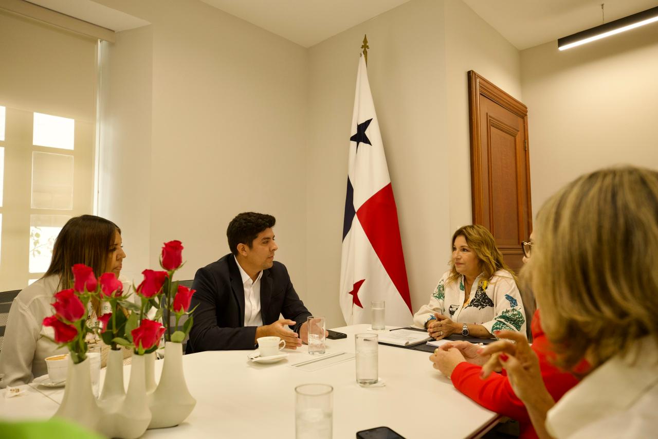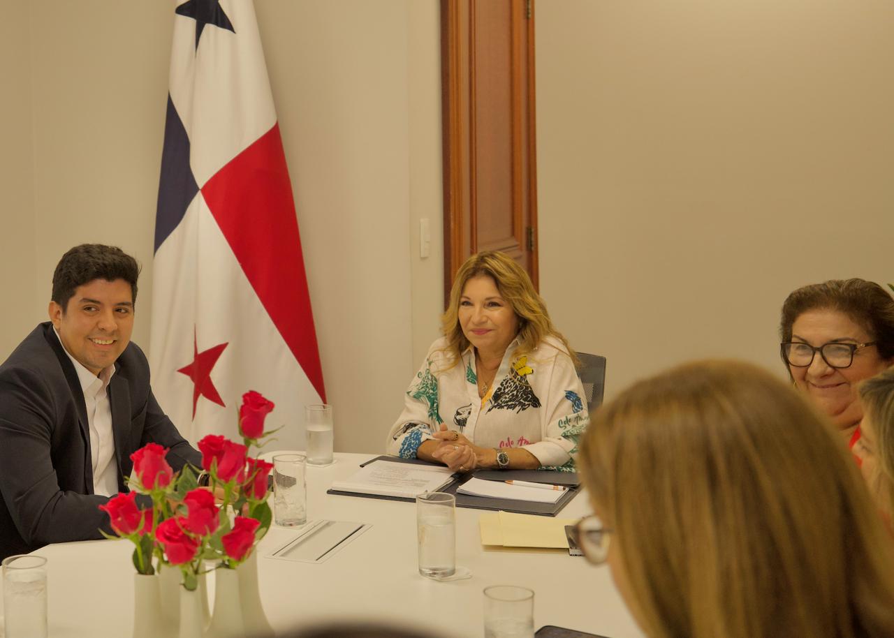 La primera dama de la República recibió en su despacho al alcalde del distrito de Los Santos, Raúl Montenegro; a la presidenta de la Junta de Festejos Patrios 2025, Oriela Solís; y a Héctor Solís, representante de Relaciones Públicas de la Alcaldía de Los Santos.