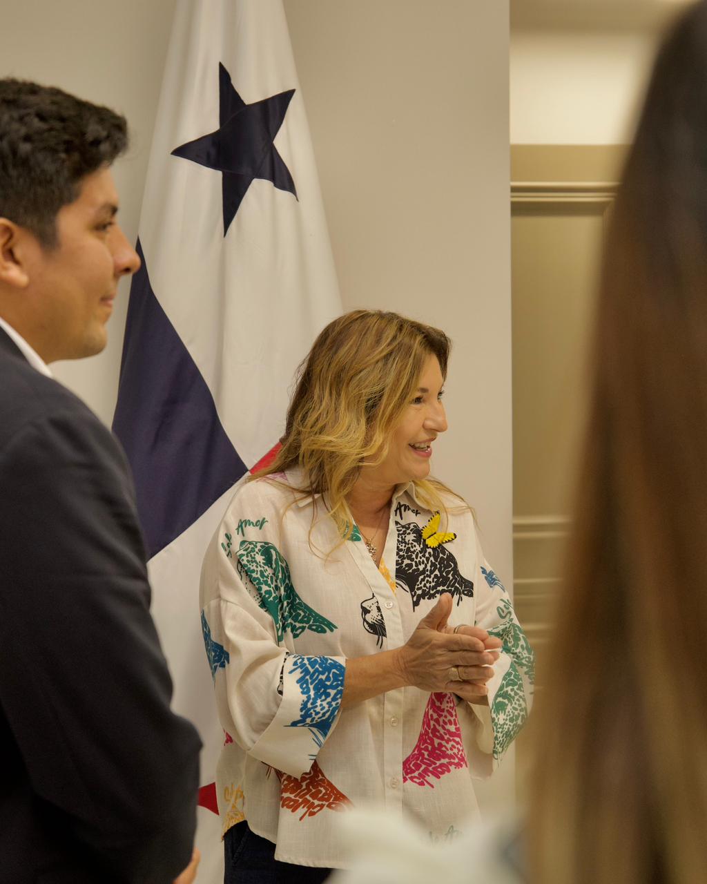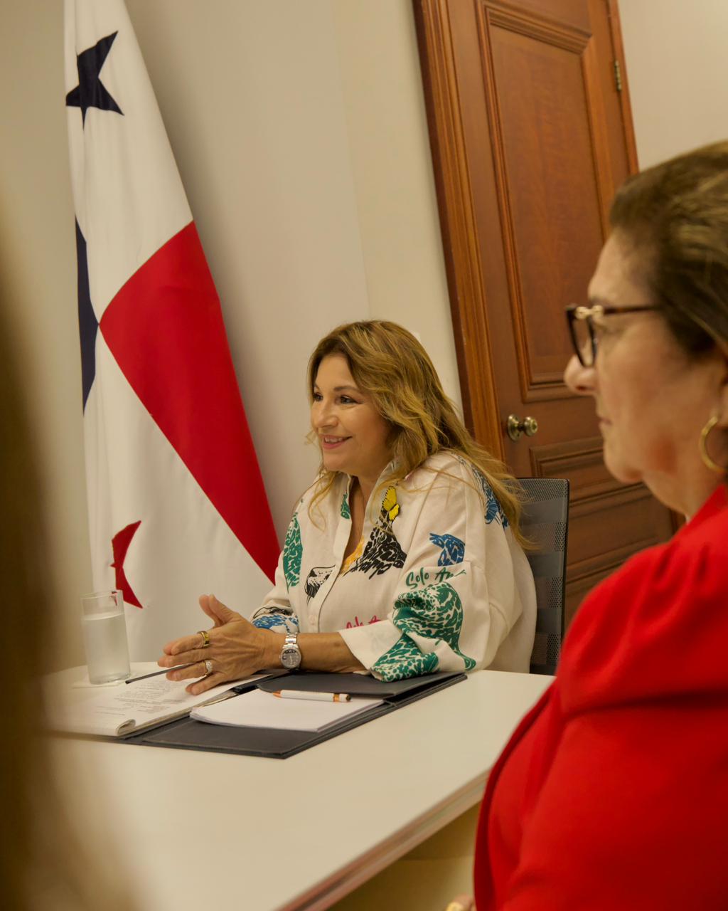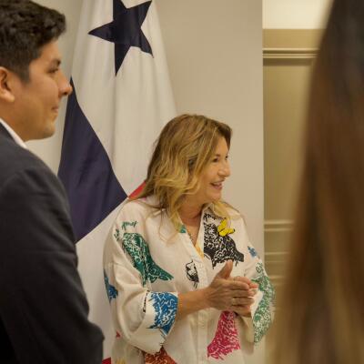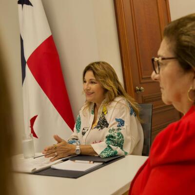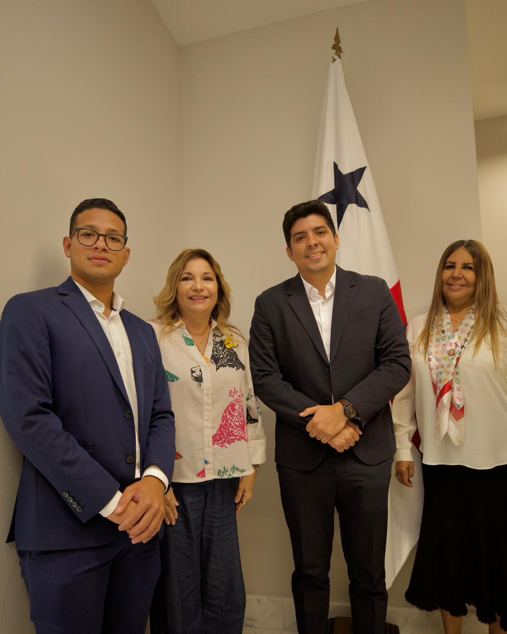 La primera dama de la República recibió en su despacho al alcalde del distrito de Los Santos, Raúl Montenegro; a la presidenta de la Junta de Festejos Patrios 2025, Oriela Solís; y a Héctor Solís, representante de Relaciones Públicas de la Alcaldía de Los Santos.