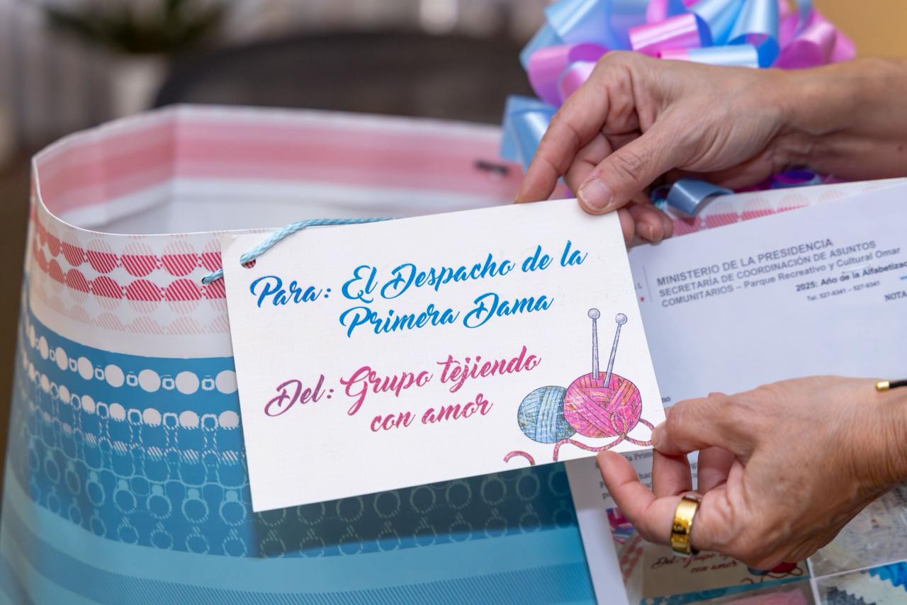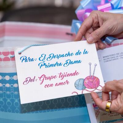 En esta ocasión, la Primera Dama recibió de parte del grupo Tejiendo con Amor unas hermosas mantitas y gorritos tejidos a mano, elaborados con dedicación para abrigar a los más pequeños.